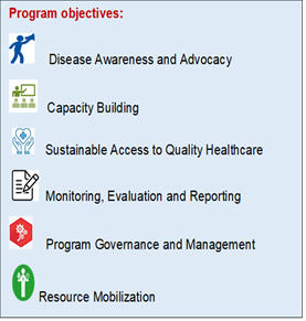 The Partners will collaborate to implement initiatives/interventions geared towards Disease Awareness and Education, Capacity Building and Training of HCWs as well as Sustainable Access to Quality Healthcare. Program Activities, Outputs and Outcomes: 12 Program Hubs in Year 1: Entry, awareness and capacity building activities for targeted therapeutic areas shall be implemented in year one at the 12 hub facilities and their communities. |